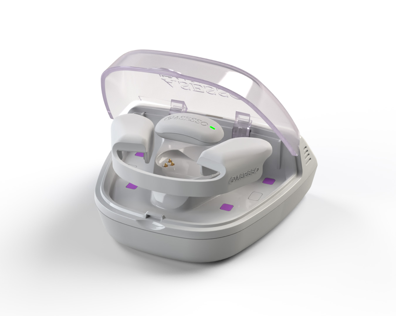 Enjoy relief wherever you are with our sleek, portable charging case equipped with disinfecting UV LEDs.